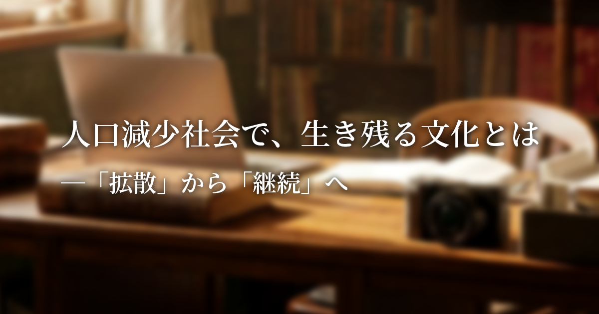 人口減少社会で、生き残る文化とは―「拡散」から「継続」へ 仕事部屋 X Facebook LINE コピー 2026.03.08 メンバーシップが必要です コンテンツにアクセスするには、会員である必要があります。 今すぐ参加 すでに会員ですか? ここからログイン